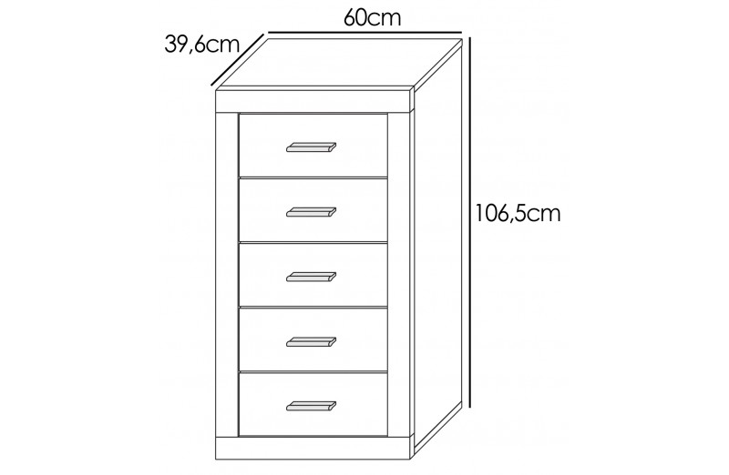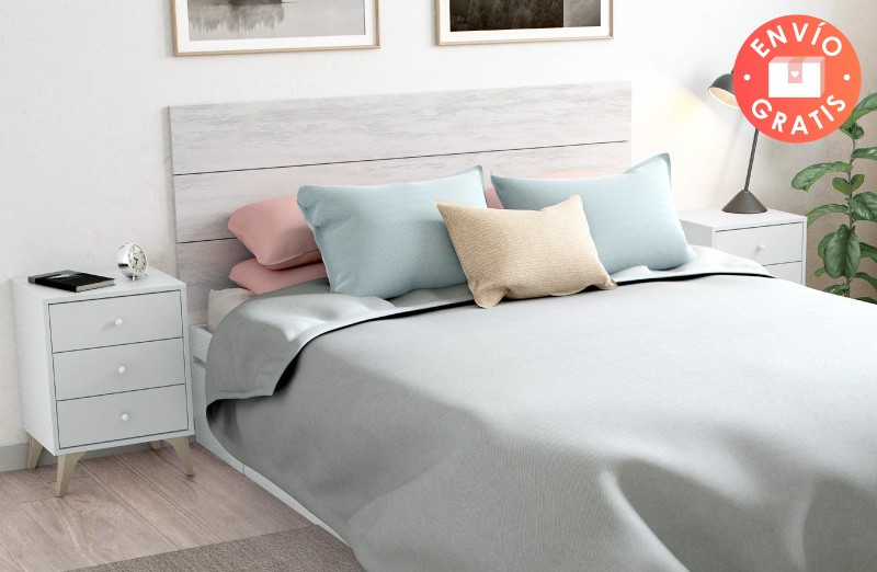 Dormitorio completo formado por dos mesitas de noche con tres cajones cada una, mural con luna, un cabecero de madera con plafones decorativos y patas que se apoyan en el suelo y un sinfonier de cinco cajones. Disponible en tres opciones de color combinado: cambria-blanco, cambria-grafito y andersen pino-gris. Los carriles de cajones de mesitas y cómoda son metálicos de gran calidad. Se presenta en KIT para garantizar el transporte sin incidencias. De fácil montaje. Elementos decorativos no incluidos.